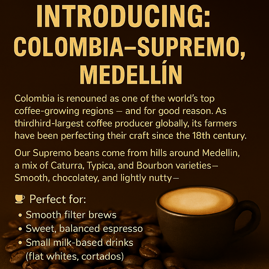 This supremo coffee from Colombia, which is of the Caturra, Typica and Bourbon varieties, is chocolatey and nutty and we source it from Medellin. A delicious mild coffee as a filter and sweet and slightly bright as an espresso.
